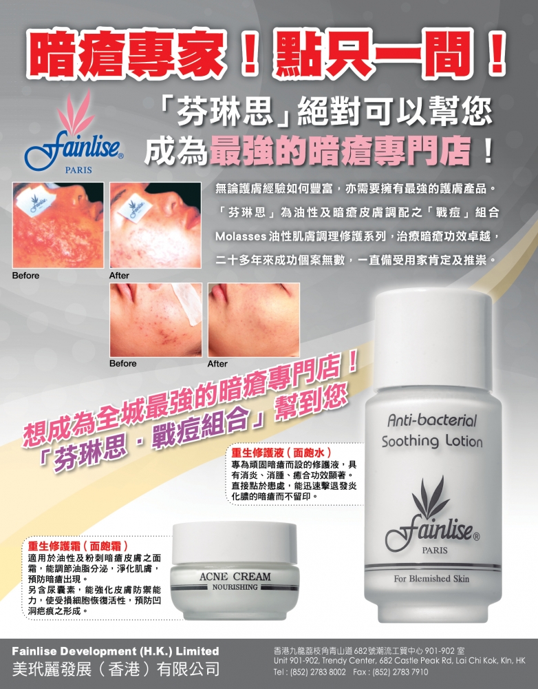 註:嚴重暗瘡患處應先點上「面皰水」(579C)。